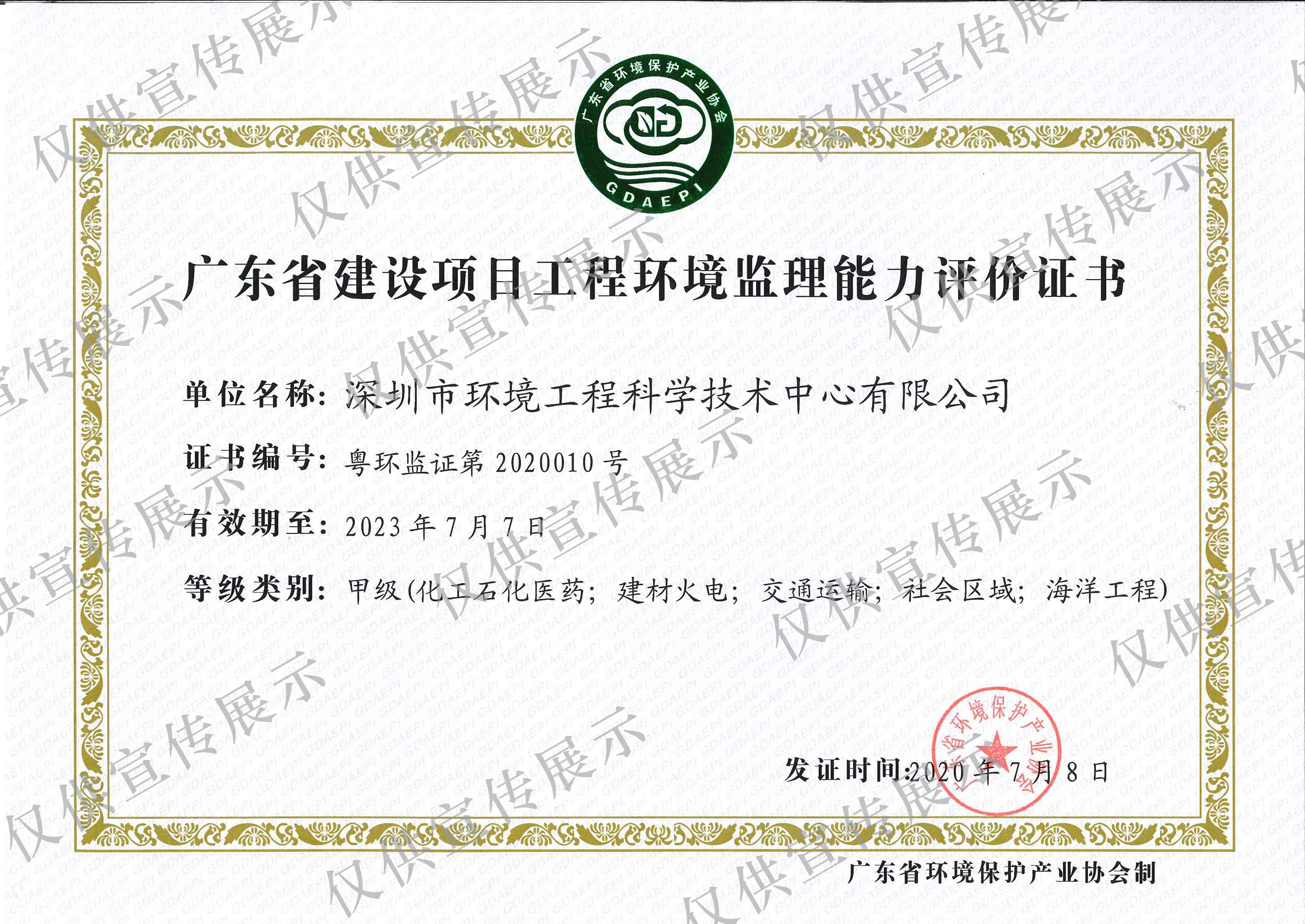 廣東省建設項目工程環(huán)境監(jiān)理能力評價證書